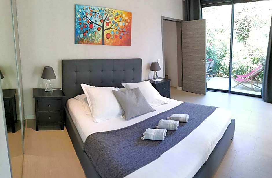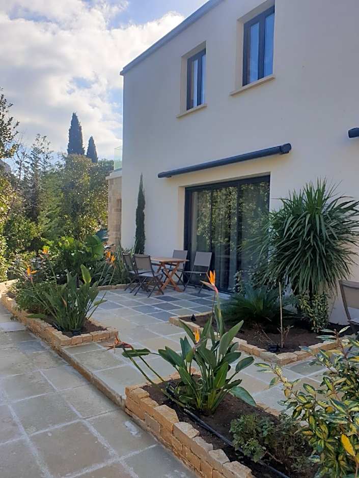 The apartment on first floor has garden view but no terrace. The one on ground floor has a little garden level terrace.